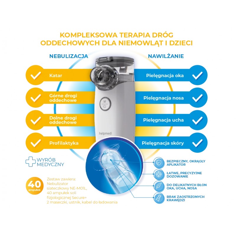 W skład zestawu wchodzi bezprzewodowy nebulizator siateczkowy oraz 40 ampułek fizjologicznego roztworu soli Katarek Secure+, który może być wykorzystywany do nebulizacji, nawilżania i pielęgnacji.