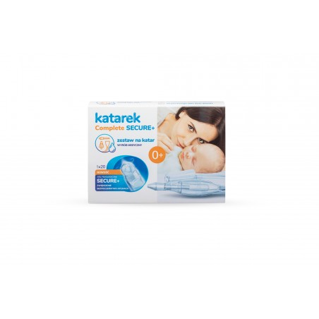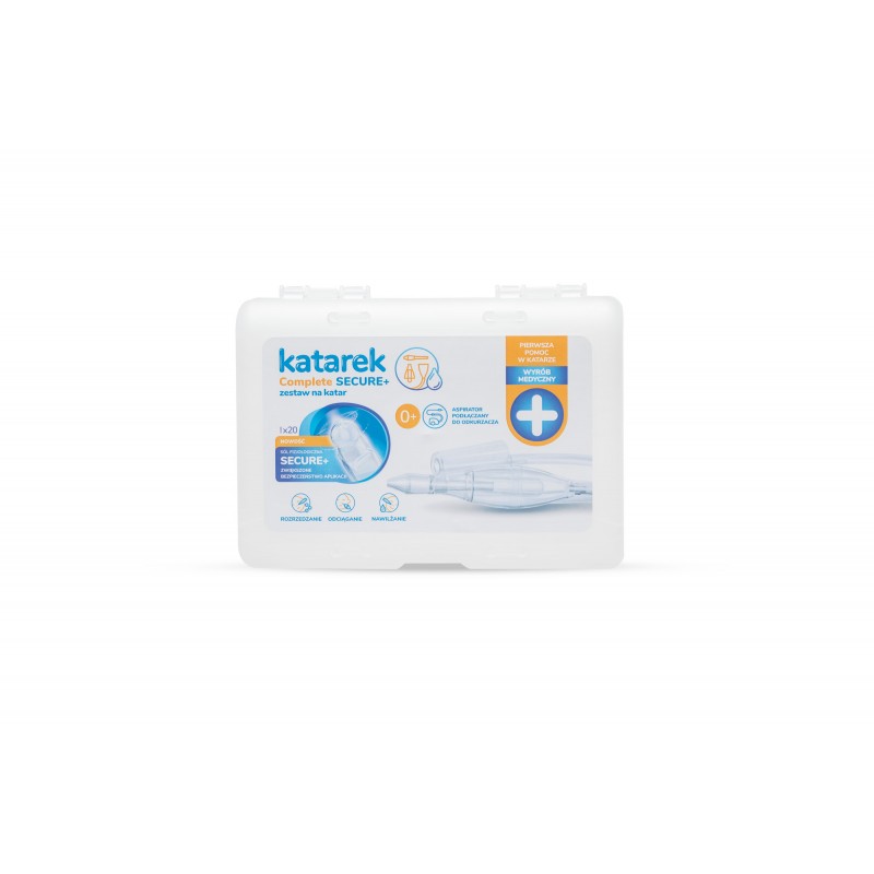 Katarek Complete to kompleksowy zestaw do walki z katarem u dzieci już od pierwszego dnia życia. W zestawie znajduje się: aspirator do odkurzacza Katarek Plus, dwie końcówki, szczoteczka do czyszczenia końcówek i komory aspiratora oraz 20 ampułek roztworu soli fizjologicznej 0,9% NaCl.