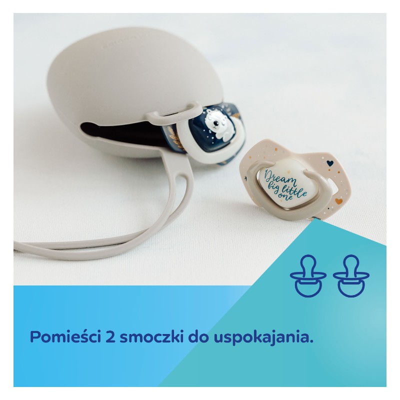 Silikonowe etui na smoczki zabezpieczy ulubiony smoczek Twojego Maluszka podczas spacerów, podróży oraz w domu. Piękne i praktyczne etui do przechowywania smoczków pomieści dwa standardowej wielkości smoczki, które będą zawsze czyste i gotowe do użycia.