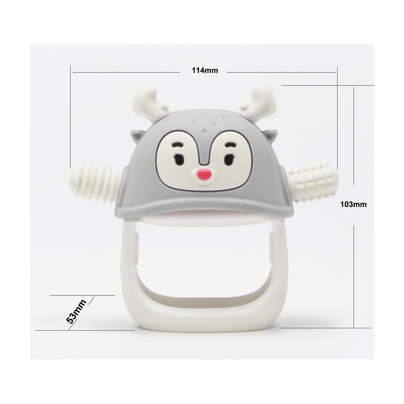 Wykonany z przyjemnego, miękkiego i bezpiecznego silikonu spożywczego gryzak dla niemowlaka Renifer został zaprojektowany na kształt piersi i sutka mamy. Na jego wypustkach znajdują się różne tekstury stymulujące dziąsła dziecka i łagodzące ból związany z ząbkowaniem