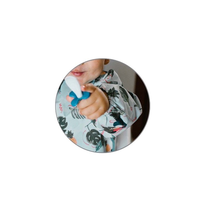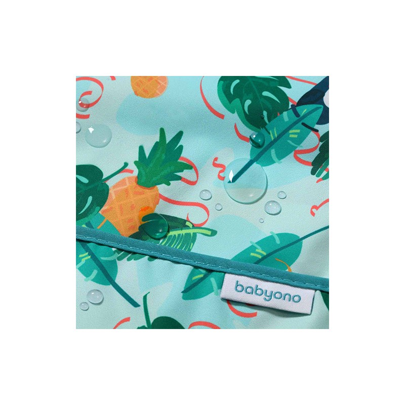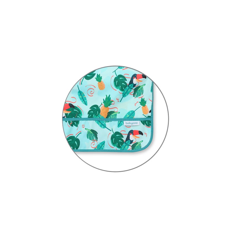 Fartuszek z rękawkami jest wodoodporny i łatwy w utrzymaniu czystości, a więc przyda się podczas nauki samodzielnego jedzenia. Możesz regulować zapięcie śliniaka i bez problemu dopasować je do obwodu szyi malucha.