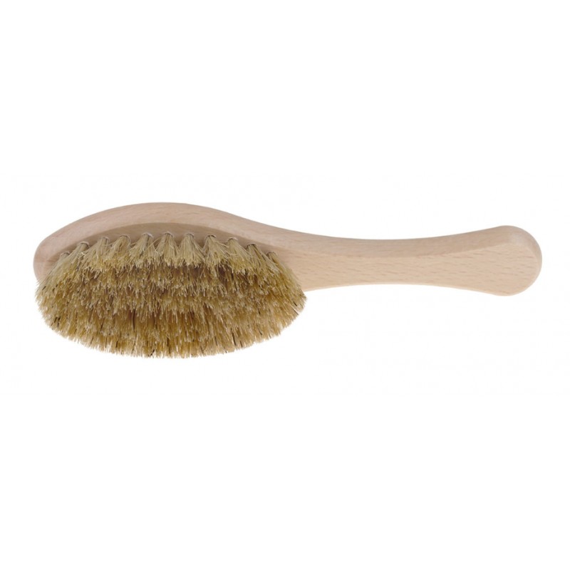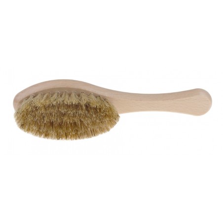 Włosie nie elektryzuje włosów, jest w pełni naturalne, a eliptyczny kształt jest bezpieczny dla dziecka. Drewniana oprawa szczotki zrobiona jest z drewna bukowego.