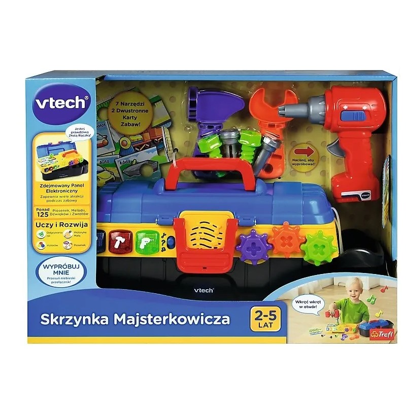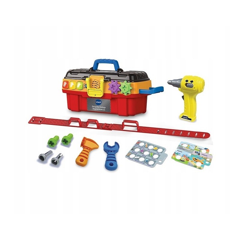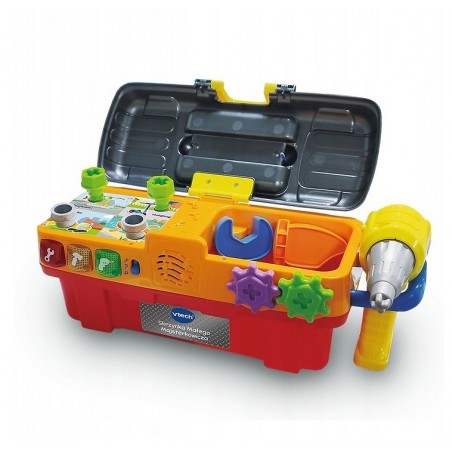 Każdy majsterkowicz znajdzie tutaj coś dla siebie. Łap skrzynkę i ruszaj w drogę! Skrzynka majsterkowicza poprzez zabawę nauczy malucha wielu rzeczy. Składa się z pojemnika na narzędzia oraz z panelu elektronicznego z przyciskami do interaktywnej zabawy.