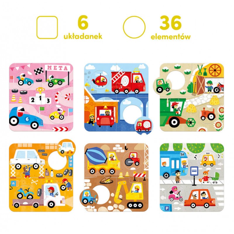 W pudełku znajdziecie aż 6 układanek, które przedstawiają ulubione pojazdy dzieciaków i dają mnóstwo możliwości zabawy. Każda duża układanka ma kółeczka, które można przekładać jak się chce. Podczas zabawy dzieci rozwijają małą motorykę, spostrzegawczość i wyobraźnię. Ułożenie puzzli to nie wszystko! Pomysły na więcej edukacyjnych zabaw znajdziecie w poradniku dołączonym do zestawu. Puzzle doskonale sprawdzają się w domu, żłobku i w podróży. Kogo zaprosicie do wspólnej zabawy?