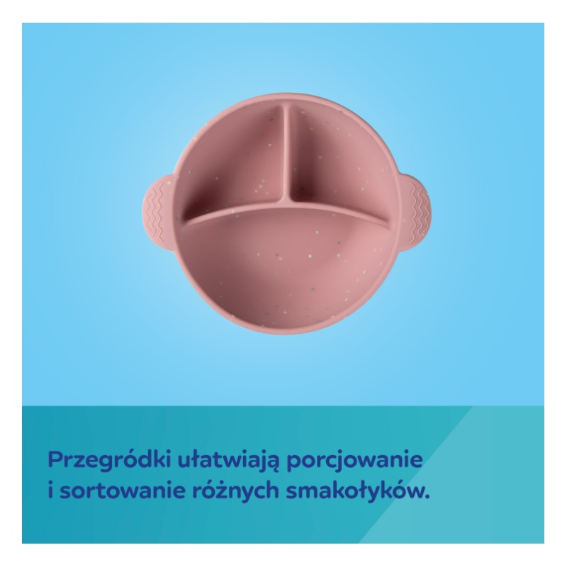 Miska silikonowa z przegródkami i przyssawką jest idealna do pierwszych posiłków Maluszka na początku jego przygody z rozszerzaniem diety, także metodą BLW (Bobas Lubi Wybór).