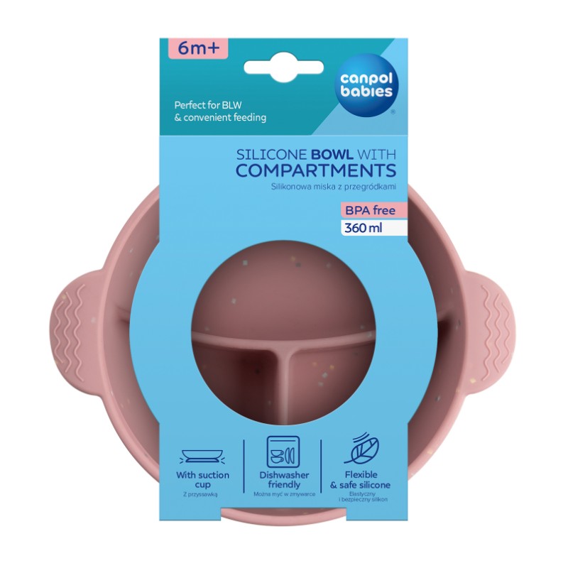Miska silikonowa z przegródkami i przyssawką jest idealna do pierwszych posiłków Maluszka na początku jego przygody z rozszerzaniem diety, także metodą BLW (Bobas Lubi Wybór). Trzy przegródki ułatwiają porcjowanie i sortowanie różnych smakołyków, co zachęca do próbowania nowych smaków i samodzielnego jedzenia. Antypoślizgowa przyssawka zapobiega niekontrolowanemu przemieszczaniu się naczynia po powierzchni stołu i uniemożliwia wywrócenie naczynia lub zrzucenie w całości na podłogę. Miska Canpol babies jest miękka i elastyczna, wykonana w 100% z wysokiej jakości silikonu przeznaczonego do kontaktu z żywnością. Posiada zaokrąglone krawędzie bez ostrych elementów, aby nie sprawiały kłopotów w samodzielnym korzystaniu przez dzieci. Jest trwała i odporna na uderzenia i upadki oraz nie pochłania zapachów. Można myć ją w zmywarce oraz podgrzewać w mikrofalówce. Wygodne uchwyty z fakturą ułatwiają rodzicowi trzymanie i zapobiegają wyślizgiwaniu się z dłoni. Miska Canpol babies została wyprodukowana ze sprawdzonych i bezpiecznych materiałów. W produkcji nie stosowano BPA, PVC, ftalanów ani innych szkodliwych substancji.