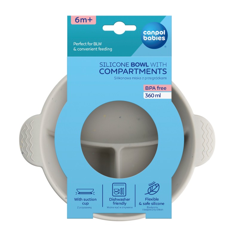 Miska silikonowa z przegródkami i przyssawką jest idealna do pierwszych posiłków Maluszka na początku jego przygody z rozszerzaniem diety, także metodą BLW (Bobas Lubi Wybór). Trzy przegródki ułatwiają porcjowanie i sortowanie różnych smakołyków, co zachęca do próbowania nowych smaków i samodzielnego jedzenia. Antypoślizgowa przyssawka zapobiega niekontrolowanemu przemieszczaniu się naczynia po powierzchni stołu i uniemożliwia wywrócenie naczynia lub zrzucenie w całości na podłogę. Miska Canpol babies jest miękka i elastyczna, wykonana w 100% z wysokiej jakości silikonu przeznaczonego do kontaktu z żywnością. Posiada zaokrąglone krawędzie bez ostrych elementów, aby nie sprawiały kłopotów w samodzielnym korzystaniu przez dzieci. Jest trwała i odporna na uderzenia i upadki oraz nie pochłania zapachów. Można myć ją w zmywarce oraz podgrzewać w mikrofalówce. Wygodne uchwyty z fakturą ułatwiają rodzicowi trzymanie i zapobiegają wyślizgiwaniu się z dłoni. Miska Canpol babies została wyprodukowana ze sprawdzonych i bezpiecznych materiałów. W produkcji nie stosowano BPA, PVC, ftalanów ani innych szkodliwych substancji.