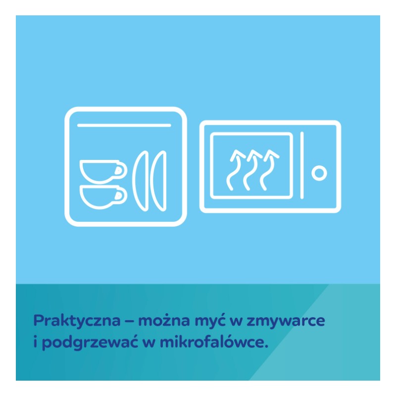 - Praktyczna – można myć w zmywarce i podgrzewać w mikrofalówce.
