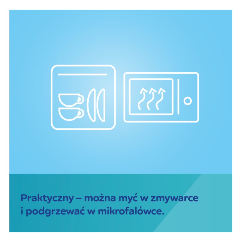 - Praktyczna – można myć w zmywarce i podgrzewać w mikrofalówce.