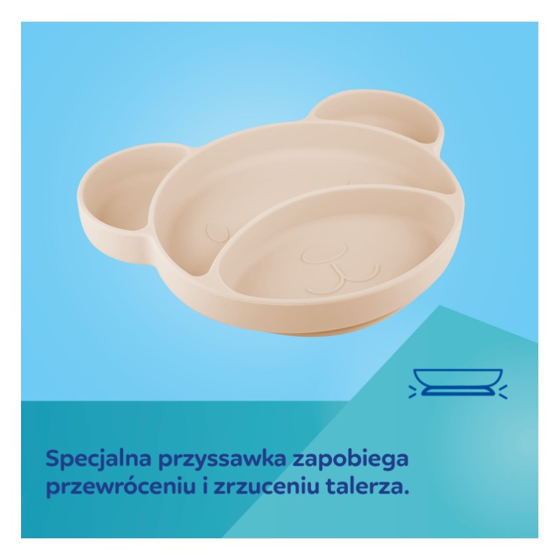 To wyjątkowy moment, kiedy Twoje dziecko zaczyna samodzielnie jeść. Silikonowy talerz z przyssawką MIŚ jest idealny do pierwszych posiłków Maluszka na początku jego przygody z rozszerzaniem diety, także metodą BLW (Bobas Lubi Wybór). Cztery przegródki ułatwiają porcjowanie i sortowanie różnych smakołyków, co zachęca do próbowania nowych smaków i samodzielnego jedzenia. Talerz ma antypoślizgową przyssawkę, która zapobiega niekontrolowanemu przemieszczaniu się naczynia po powierzchni stołu lub blatu krzesełka do karmienia, uniemożliwia wywrócenie naczynia lub zrzucenie w całości na podłogę. Talerzyk trójdzielny z przyssawką został wykonany w 100% z wysokiej jakości silikonu przeznaczonego do kontaktu z żywnością. Talerz silikonowy jest elastyczny, wytrzymały i nietłukący się, co jest bardzo istotne w przypadku małych dzieci. Można myć w zmywarce i podgrzewać w mikrofalówce.