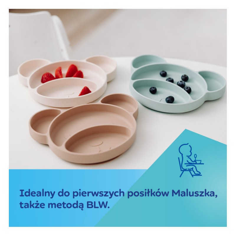 Silikonowy talerz z przyssawką MIŚ jest idealny do pierwszych posiłków Maluszka na początku jego przygody z rozszerzaniem diety, także metodą BLW (Bobas Lubi Wybór).