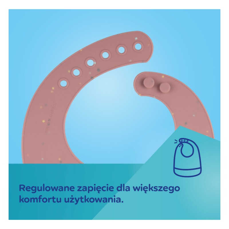 Wodoodporny śliniak silikonowy z kieszonką jest niezbędny podczas rozszerzania diety Maluszka i pierwszych samodzielnych posiłkach. Doskonale zabezpieczy ubranko dziecka przed zabrudzeniem i przemoczeniem podczas jedzenia. Jest lekki, miękki, elastyczny i przyjemny w dotyku. Został wykonany w 100% z wysokiej jakości silikonu przeznaczonego do kontaktu z żywnością, dzięki czemu jest bezpieczny i bezzapachowy. Praktyczna głęboka kieszonka zatrzymuje resztki jedzenia, które nie trafiło do buzi dziecka. Kieszonka jest tak zaprojektowana, aby wypełniona jedzeniem zachowała swój kształt i dziecko nie opróżniło jej przez przypadek podczas poruszania się czy naciskania na nią. Śliniak jest łatwy do czyszczenia – można przepłukać go pod bieżącą wodą, przetrzeć lub umyć w zmywarce.
