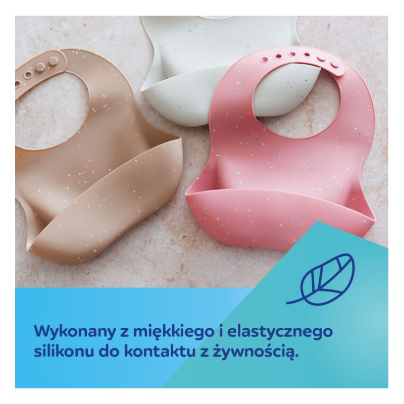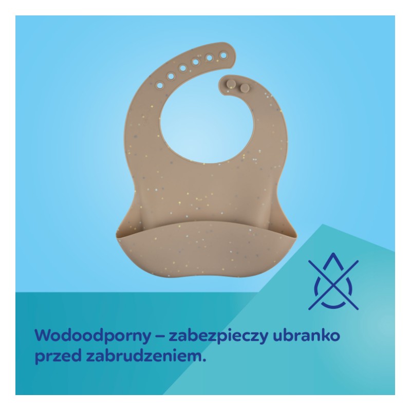 Wodoodporny śliniak silikonowy z kieszonką jest niezbędny podczas rozszerzania diety Maluszka i pierwszych samodzielnych posiłkach. Doskonale zabezpieczy ubranko dziecka przed zabrudzeniem i przemoczeniem podczas jedzenia. Jest lekki, miękki, elastyczny i przyjemny w dotyku. Został wykonany w 100% z wysokiej jakości silikonu przeznaczonego do kontaktu z żywnością, dzięki czemu jest bezpieczny i bezzapachowy. Praktyczna głęboka kieszonka zatrzymuje resztki jedzenia, które nie trafiło do buzi dziecka. Kieszonka jest tak zaprojektowana, aby wypełniona jedzeniem zachowała swój kształt i dziecko nie opróżniło jej przez przypadek podczas poruszania się czy naciskania na nią. Śliniak jest łatwy do czyszczenia – można przepłukać go pod bieżącą wodą, przetrzeć lub umyć w zmywarce.
