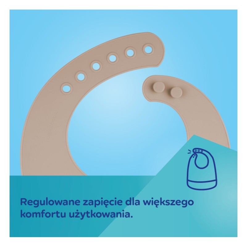 Wodoodporny śliniak silikonowy z kieszonką jest niezbędny podczas rozszerzania diety Maluszka i pierwszych samodzielnych posiłkach. Doskonale zabezpieczy ubranko dziecka przed zabrudzeniem i przemoczeniem podczas jedzenia. Jest lekki, miękki, elastyczny i przyjemny w dotyku. Został wykonany w 100% z wysokiej jakości silikonu przeznaczonego do kontaktu z żywnością, dzięki czemu jest bezpieczny i bezzapachowy. Praktyczna głęboka kieszonka zatrzymuje resztki jedzenia, które nie trafiło do buzi dziecka. Kieszonka jest tak zaprojektowana, aby wypełniona jedzeniem zachowała swój kształt i dziecko nie opróżniło jej przez przypadek podczas poruszania się czy naciskania na nią. Śliniak jest łatwy do czyszczenia – można przepłukać go pod bieżącą wodą, przetrzeć lub umyć w zmywarce.