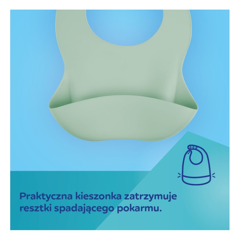 • Praktyczna kieszonka zatrzymuje resztki spadającego pokarmu.