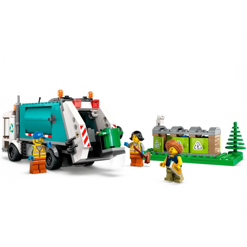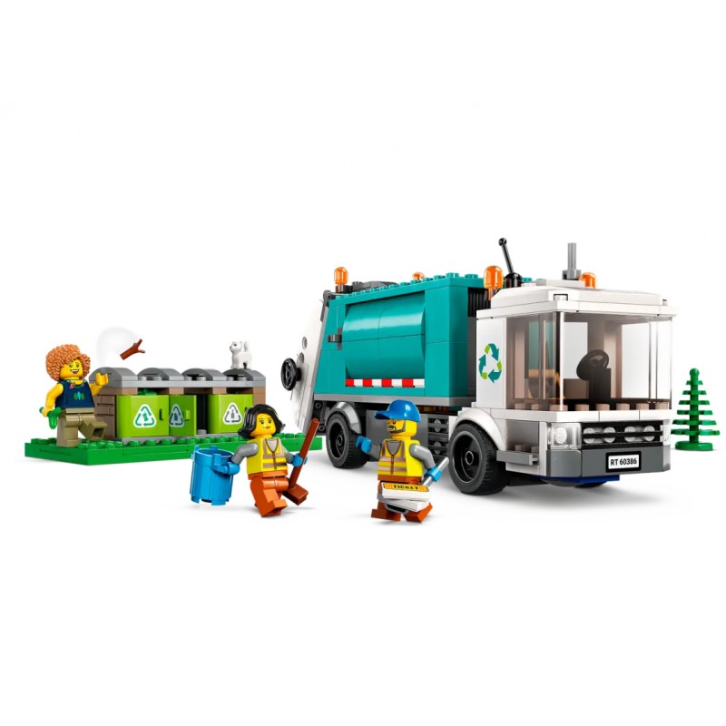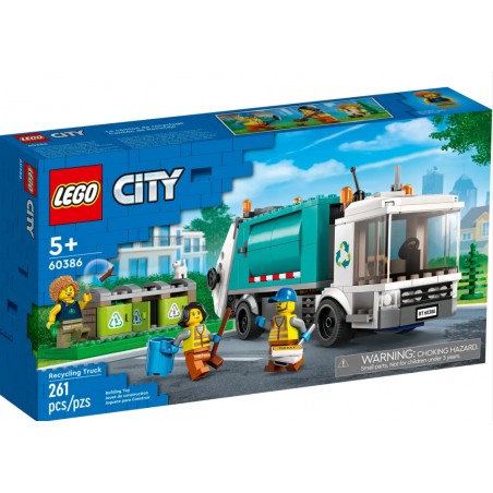 Ten zestaw dla dzieci od piątego roku życia LEGO® City Ciężarówka recyklingowa (60386) zawiera wiele realistycznych elementów, w tym centrum recyklingu z trzema pojemnikami. Ciężarówka ma przechylany podnośnik do opróżniania pojemników i podnoszoną platformę do wyładowywania.