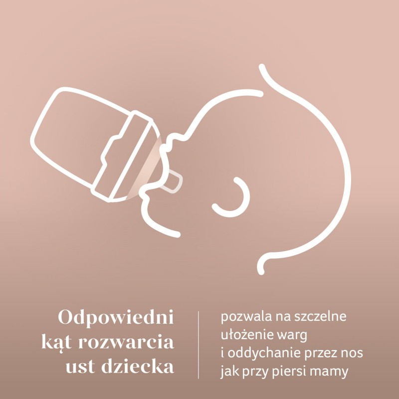 - Kształt i proporcje wzorowane na piersi mamy, co pozwala dziecku na naturalne i właściwe ułożenie warg.