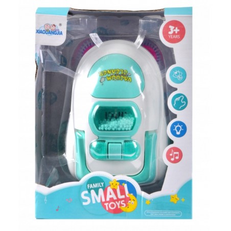 Odkurzacz posiada efekty dźwiękowe oraz świetlne, podczas pracy powoduje wirowanie styropianowych kuleczek dołączonych do zestawu. Najwyższy czas na porządki. Pozwól dziecku pomóc Ci w podstawowych obowiązkach domowych np. odkurzaniu Produkt ten idealnie odzwierciedla prawdziwy sprzęt domowy, wydając odgłosy odkurzania. Zawartość zestawu: