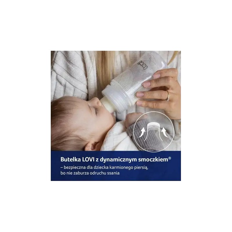 Butelka do podawania odciągniętego mleka mamy. Bezpieczna dla dziecka karmionego piersią, gdyż nie zaburza odruchu ssania i nie koliduje z karmieniem naturalnym. Wyposażona w profesjonalny smoczek dynamiczny® zbudowany z niejednorodnych warstw silikonu (cienka, dynamiczna, wydłużająca się końcówka i twarda, profilowana podstawa). Dzięki temu wymaga od dziecka aktywnego ssania: silnej pracy mięśni warg i języka. Profilowany kształt butelki ułatwia prawidłowe jej trzymanie i podanie pokarmu w bezpiecznej pozycji.