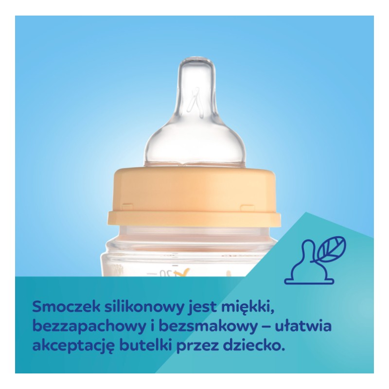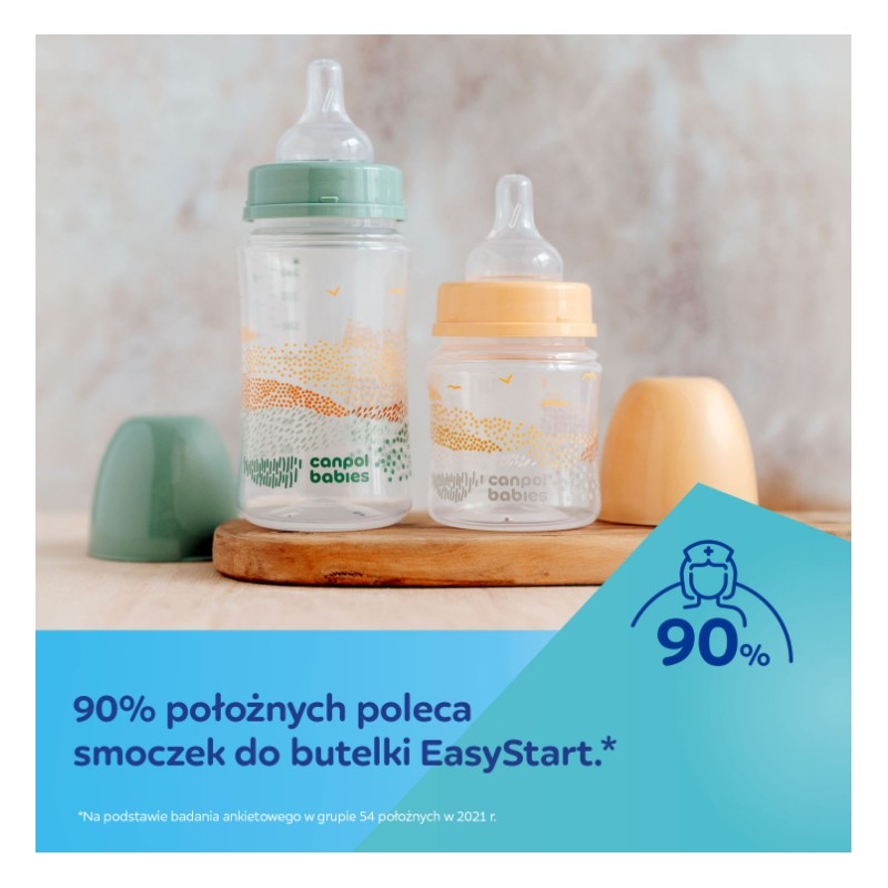 Butelki EasyStart to po prostu łatwy start w karmieniu butelką. Smoczek został wykonany z miękkiego i hipoalergicznego silikonu, dzięki czemu jest bardzo wytrzymały, nie odkształca się, nie wysycha i nie odbarwia. Jest bezzapachowy i bezsmakowy, co ułatwia akceptację butelki przez dziecko, a jego kształt przypomina pierś mamy, umożliwiając karmienie naprzemienne – karmienie piersią i butelką. Aż 90% położnych poleca smoczek do butelki EasyStart.*