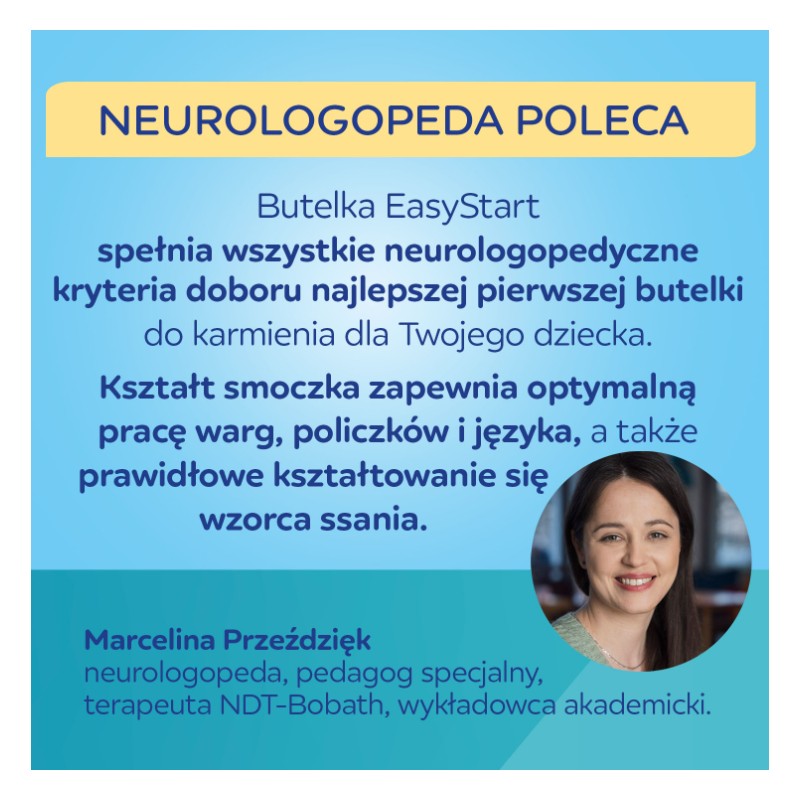 „Butelka EasyStart spełnia wszystkie neurologopedyczne kryteria doboru najlepszej pierwszej butelki do karmienia dla Twojego dziecka. Kształt smoczka pozwala na optymalną pracę warg, policzków i języka, a także prawidłowe kształtowanie się wzorca ssania.”