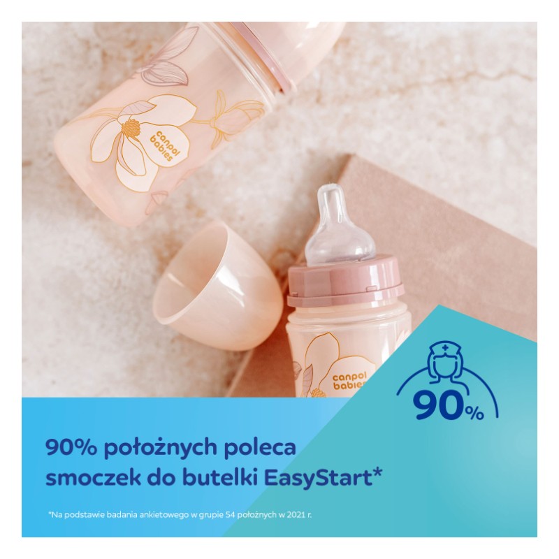Butelki EasyStart to po prostu łatwy start w karmieniu butelką. Smoczek został wykonany z miękkiego i hipoalergicznego silikonu, dzięki czemu jest bardzo wytrzymały, nie odkształca się, nie wysycha i nie odbarwia. Jest bezzapachowy i bezsmakowy, co ułatwia akceptację butelki przez dziecko, a jego kształt przypomina pierś mamy, umożliwiając karmienie naprzemienne – karmienie piersią i butelką. Aż 90% położnych poleca smoczek do butelki EasyStart.*