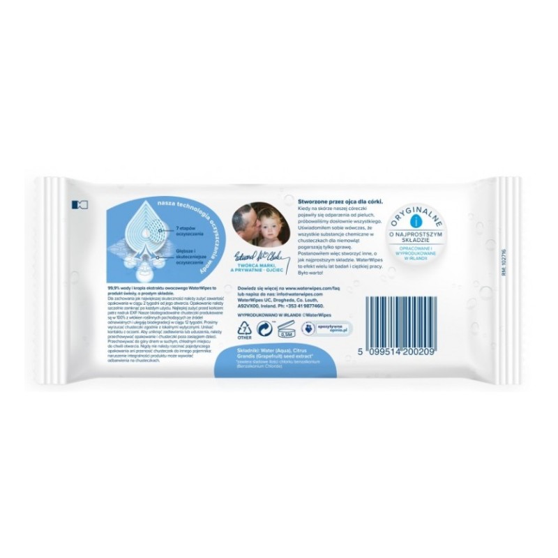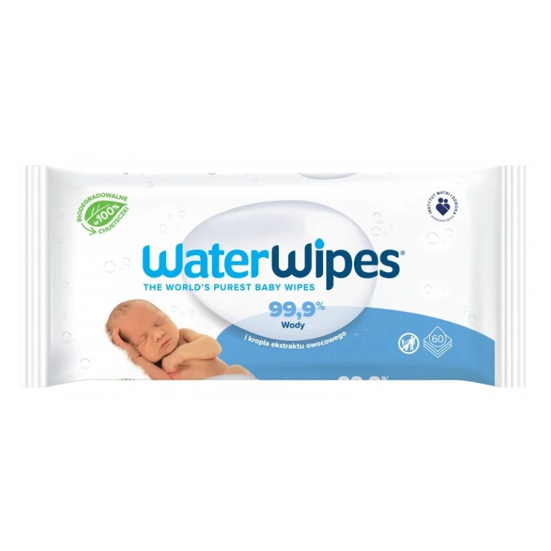 Chusteczki nawilżane WaterWipes to w 100% biodegradowalne chusteczki przeznaczone do oczyszczania delikatnej skóry dzieci i niemowląt od pierwszych chwil życia. Nowy wariant uwielbianych chusteczek jest przyjazny dla maluszka i bezpieczny dla środowiska. Chusteczki cechuje niezwykle prosty skład - czysta woda z kroplą ekstraktu z pestek grejpfruta.