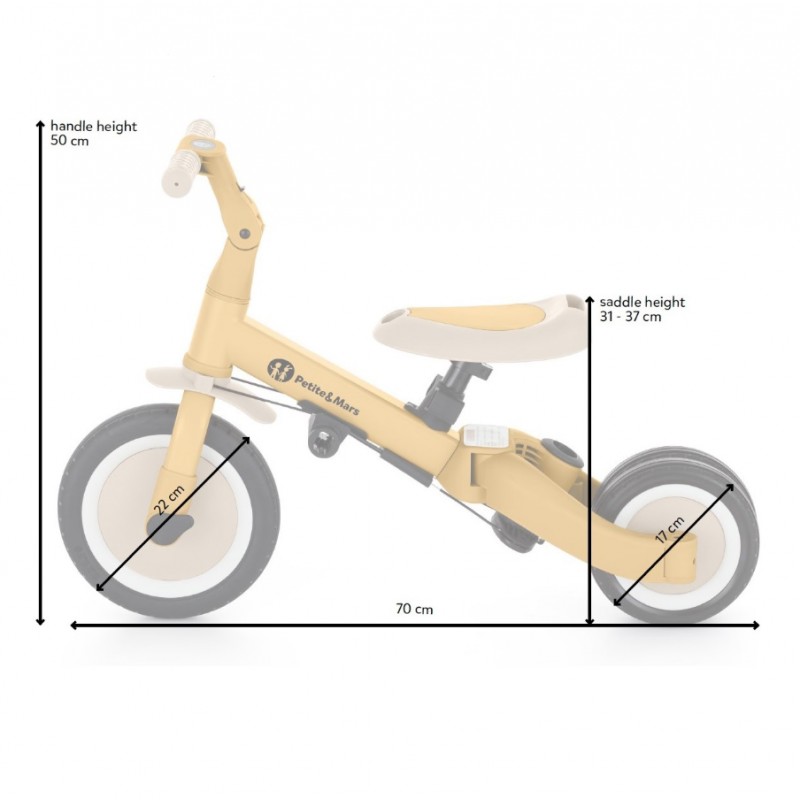 Mimo swojej rozbudowanej funkcjonalności, pozostaje lekki i praktyczny, ważąc zaledwie 5,6 kilograma i mając kompaktowe wymiary: 67 cm długości, 46 cm szerokości w wersji trójkołowej oraz regulowaną wysokość siodełka od 31 do 37 cm.
