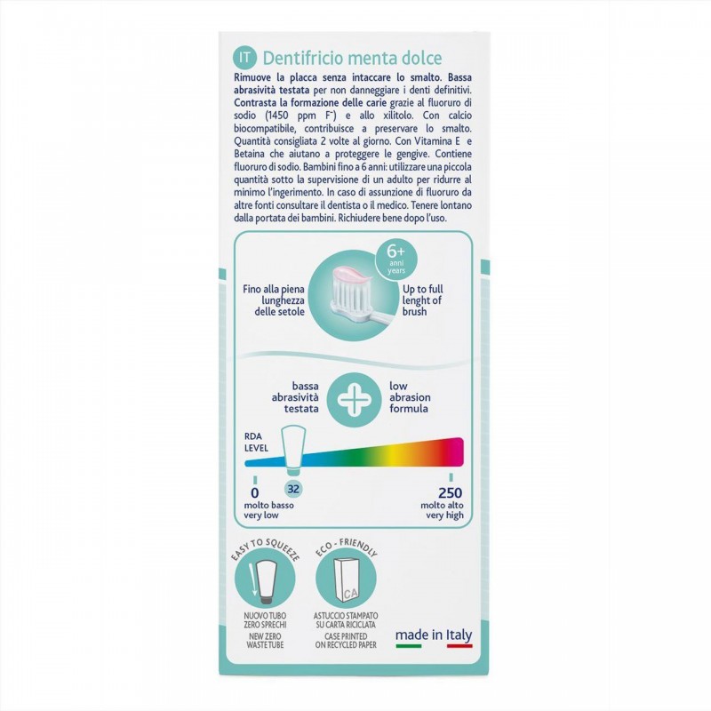Zapobiega powstawaniu próchnicy dzięki fluorkowi sodu (1450 ppm F-) i ksylitolowi.
