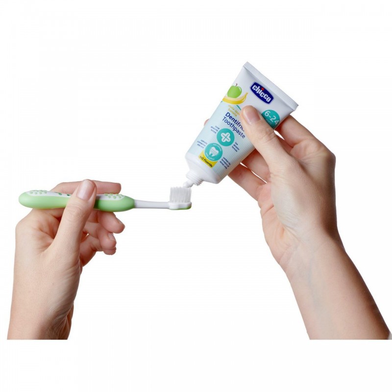 Fluorek sodu (1000 ppm) dla skutecznej ochrony przed próchnicą; zawartość fluoru jest zgodna z rekomendacjami EAPD (European Academy of Paediatric Dentistry) z 2019 r.