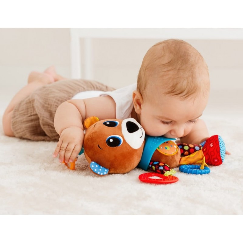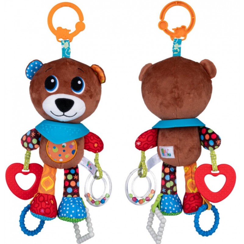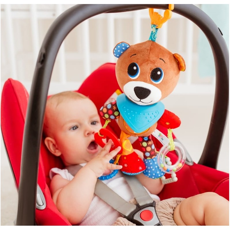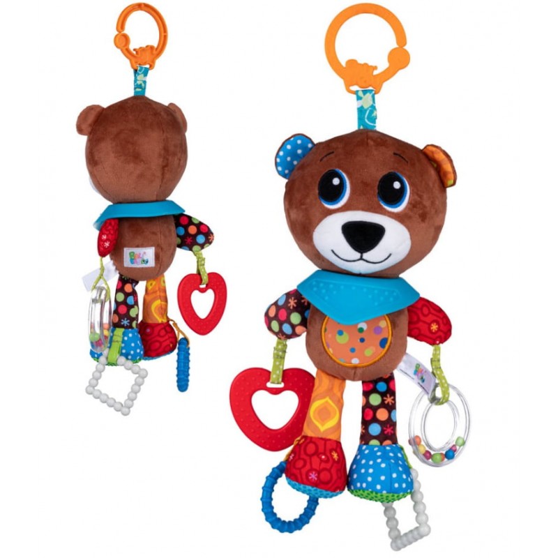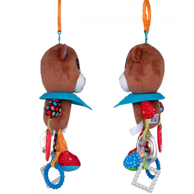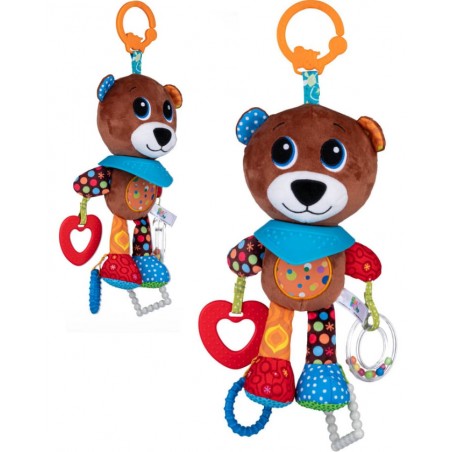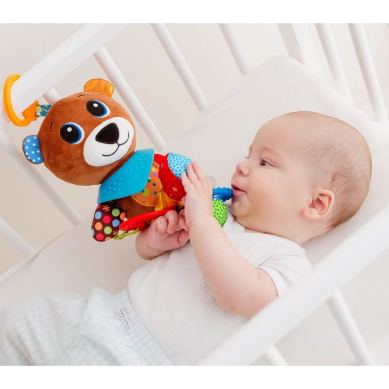 Misiek wyposażony został w kilka gryzaków z wypustkami i kółeczko-grzechotkę, pełną kolorowych kuleczek.