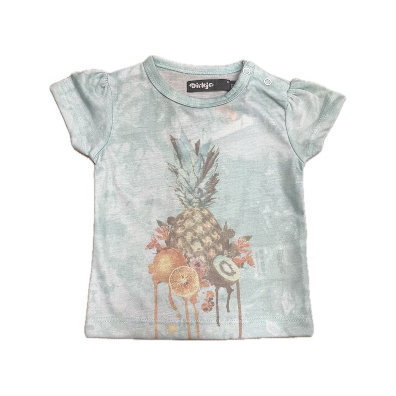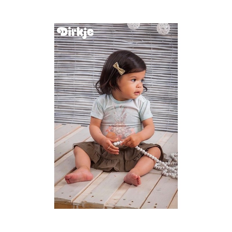Śliczna koszulka Dirkje dla dziewczynki w miętowym, pastelowym kolorze z nadrukiem. Koszulka zapinana z boku przy szyi na dwa napy.