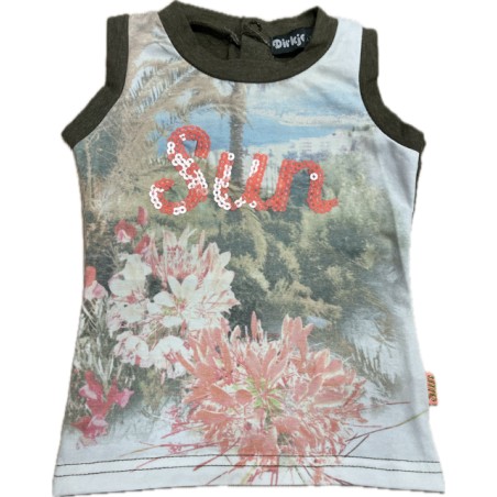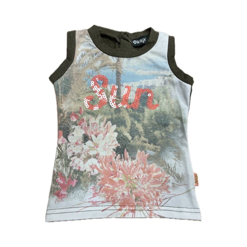Śliczna koszulka Dirkje dla dziewczynki na szerokich ramiączkach z ozdobnym nadrukiem i cekinowym napisem.