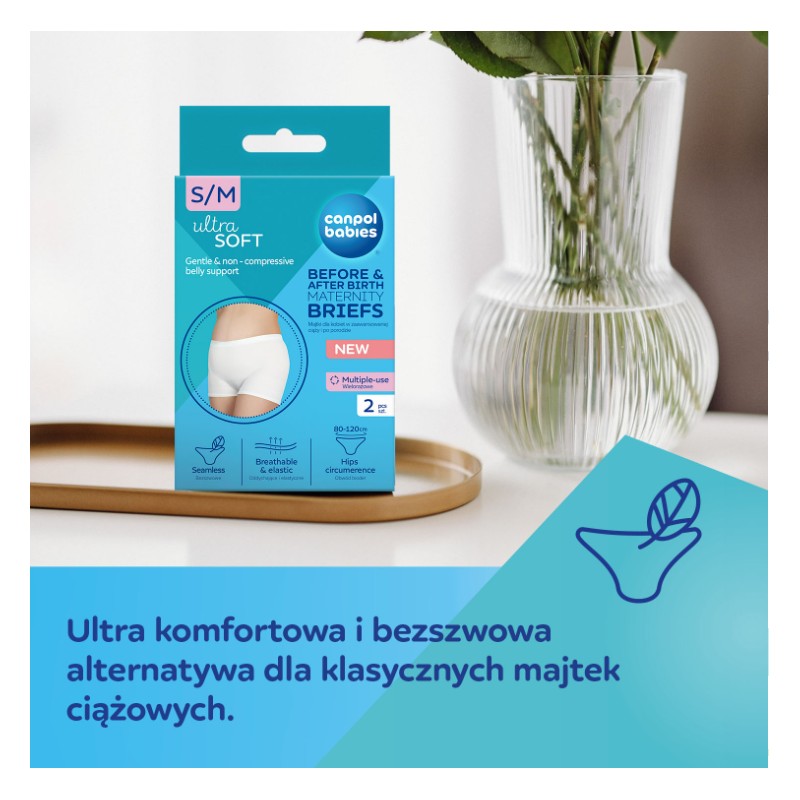Wysoki stan majtek jest delikatny dla blizny po cesarskim cięciu. Majtki dla ciężarnych Canpol babies są wielorazowe i można je prać.