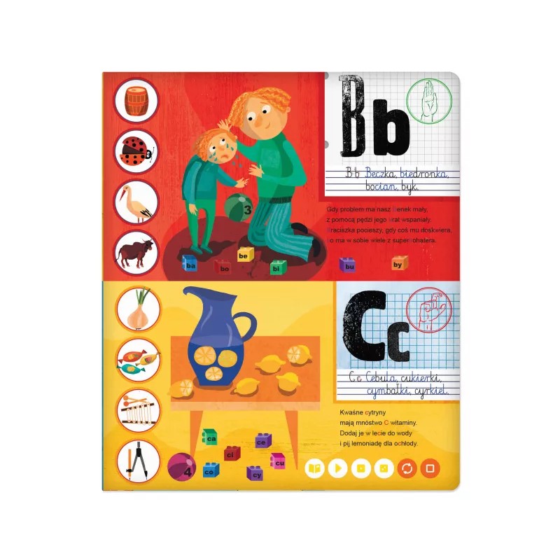 Książka Moje pierwsze literki to pomoc w procesie nauki czytania. Dzięki tej interaktywnej lekturze dzieci poznają litery, litery pisane i znaki migowe. Nauczą się odczytywać sylaby i dzielić na nie wyrazy, co ułatwi im naukę płynnego czytania.