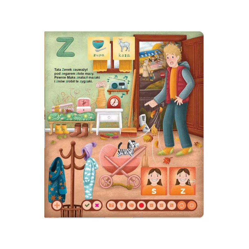 Obejmuje liczne ćwiczenia słuchowe, sylabowe i głoskowe. Informacje rozszerzone, ukryte pod ikoną żarówki, czytane są przez autorkę tekstu, neurologopedkę Urszulę Petrycką-Frugę.