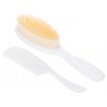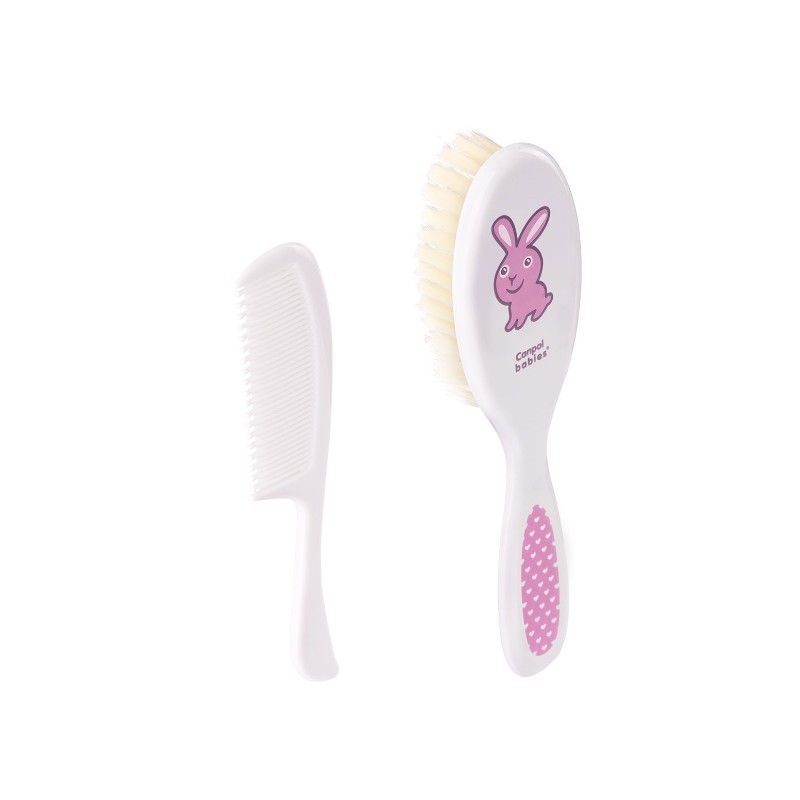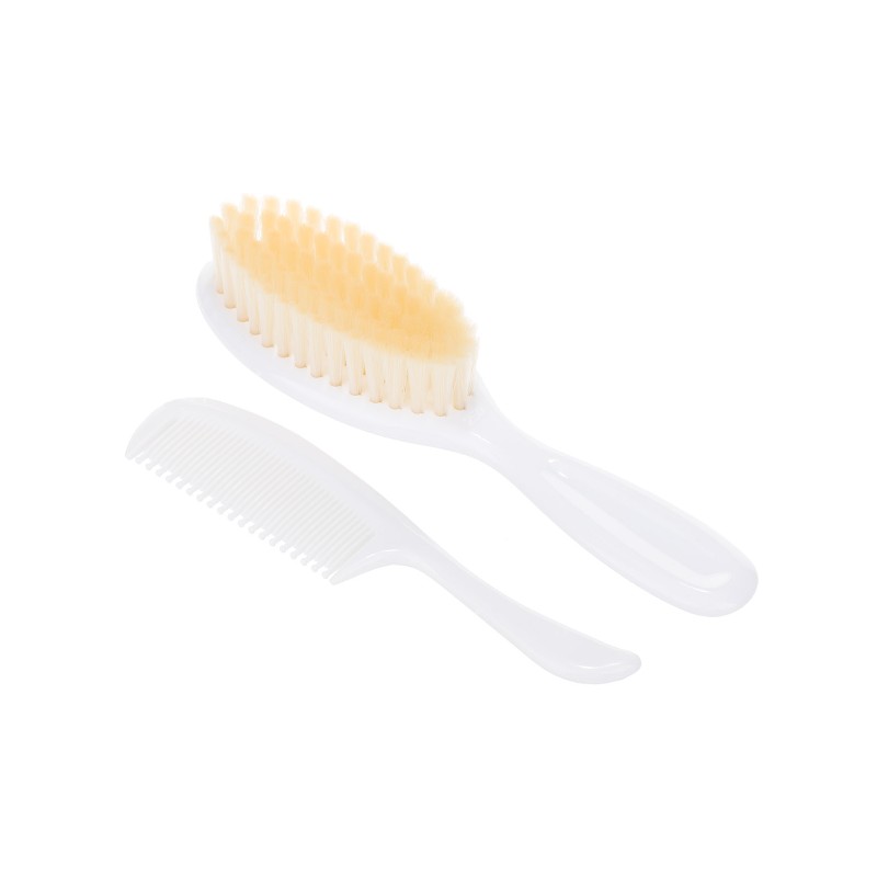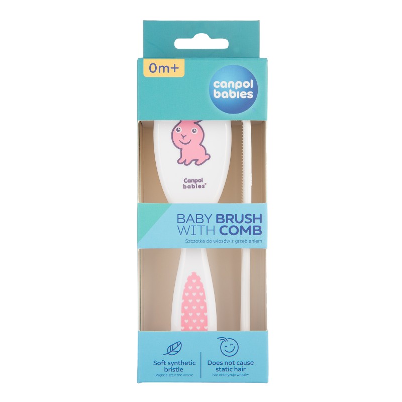 Szczotka do włosów z grzebykiem do codziennej pielęgnacji włosów dziecka. Grzebień posiada zaokrąglone ząbki, które nie podrażniają skóry. Szczotka z miękkim, sztucznym włosiem delikatnie masuje główkę malucha, nie elektryzując włosów.