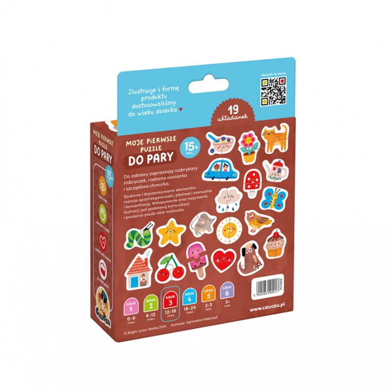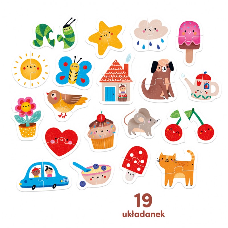 Moje pierwsze puzzle Do pary to wyjątkowo uroczy zestaw dla dzieci, które zaczynają przygodę z puzzlami. Składa się aż z 19 kolorowych, dwuelementowych układanek. Układanie to wyzwanie, ale każde dopasowanie elementów to powód do dumy. Zabawa start!