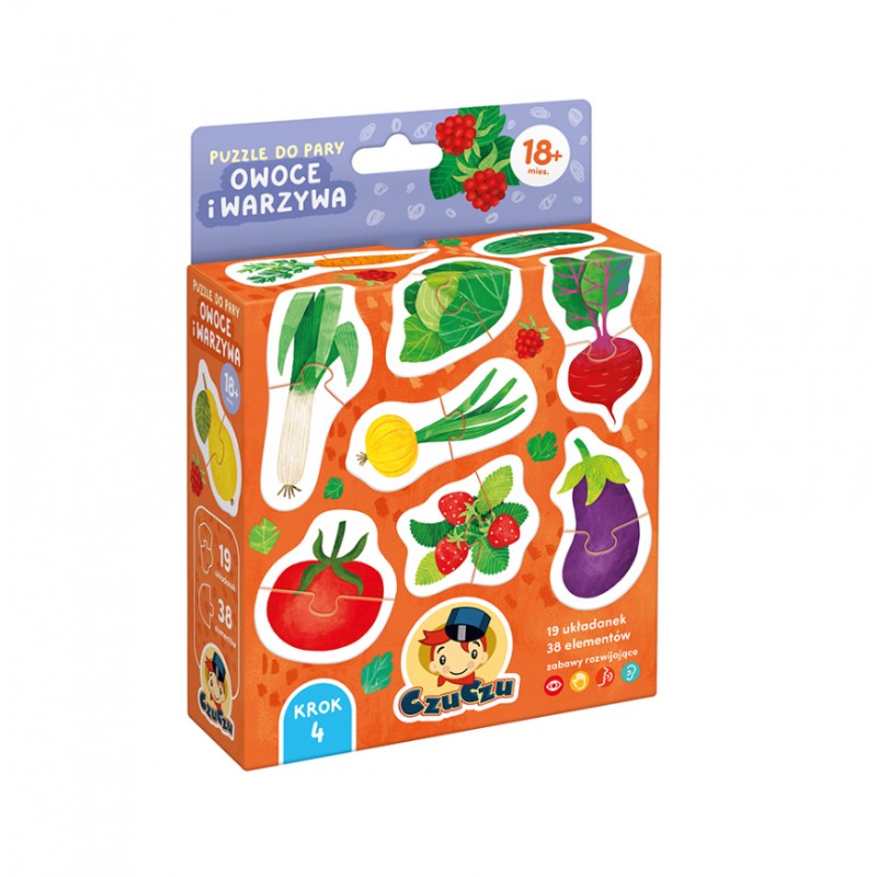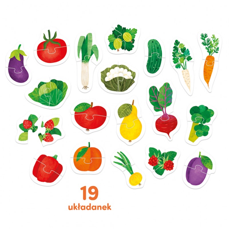 Puzzle do pary Owoce i warzywa to edukacyjny zestaw, który zawiera 19 kolorowych, dwuelementowych układanek! Bawcie się razem na wiele sposobów: