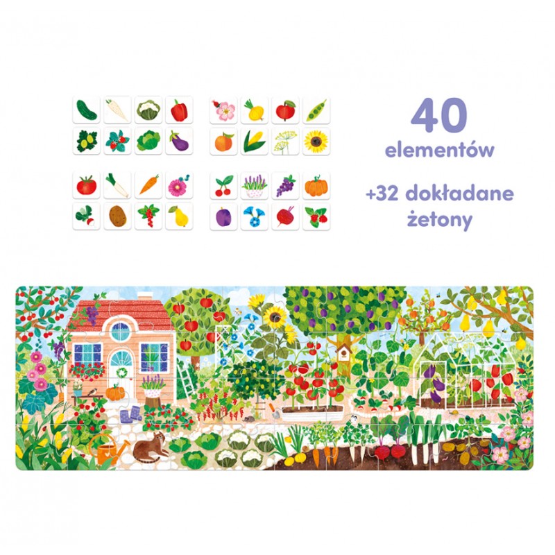 Soczyście kolorowa i duża układanka składa się z 40 elementów i przedstawia kwitnący ogród i sad. 32 owoce i warzywa znajdują się na dodatkowych kafelkach do dokładania. Umożliwia to mnóstwo fascynujących i wszechstronnie rozwijających zabaw, które pozwolą lepiej zrozumieć i zapamiętać, co rośnie w ogródku.