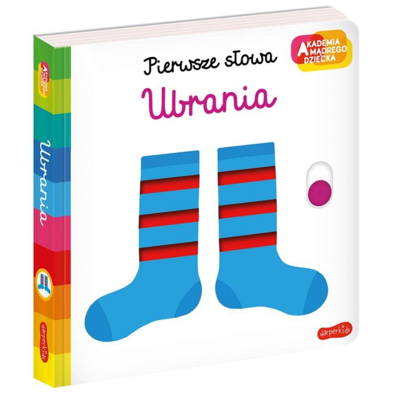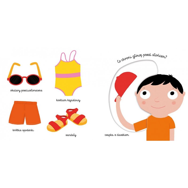 Książeczka z serii Pierwsze słowa Ubrania pokazuje małemu czytelnikowi różne rodzaje ubrań. Malec uczy się, co może włożyć, gdy pada deszcz, co w upalny letni dzień i przed pójściem spać.