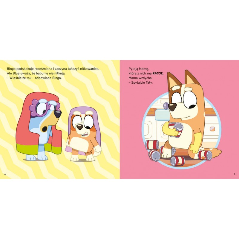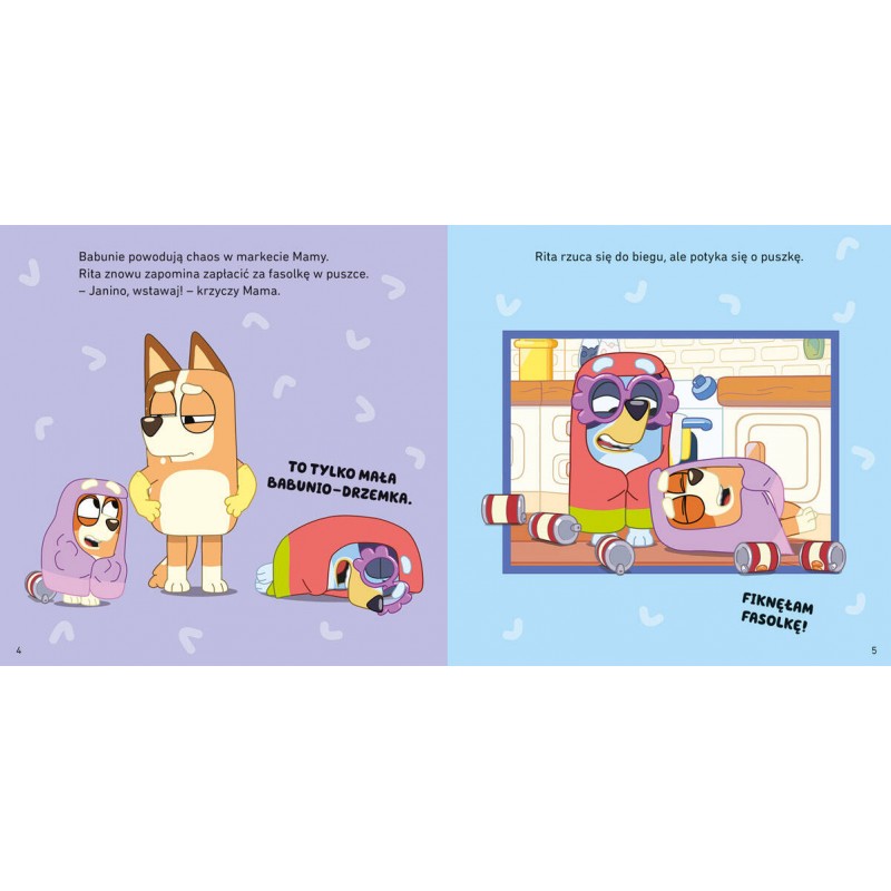 Ta zabawna, ale i mądra opowieść została napisana na motywach niezwykle popularnego odcinka serialu o przygodach Bluey i Bingo, a ilustracje zostały zaczerpnięte wprost z animacji. Jest tu wszystko, co uwielbiają fani i fanki kreskówki w każdym wieku – wyjątkowy humor, zabawne wyrażenia, codzienne życiowe prawdy, dużo pozytywnej energii i mądre, acz nienarzucające się przesłanie. Nic dziwnego, że przygody australijskiej rodziny piesków ogląda cały świat, a pieski Bluey i Bingo podbiły bez reszty serca polskich widzów! Książeczka ma niewielki format i z łatwością zmieści się do torebki mamy, kieszeni taty albo do dziecięcego plecaka, dzięki czemu może towarzyszyć młodemu czytelnikowi w podróży, w poczekalni u lekarza i wszędzie tam, gdzie czai się nuda. Dzięki dużym literom i prostym tekstom doskonale nadaje się do nauki czytania, a kolorowe ilustracje można oglądać nawet wtedy, gdy treść opowiadania zna się już na pamięć. Oprócz tytułu Babunie w serii ukazało się także opowiadanie Plaża, a już niebawem kolejne książeczki – Dobranoc, nietoperzu i Tato-robot.