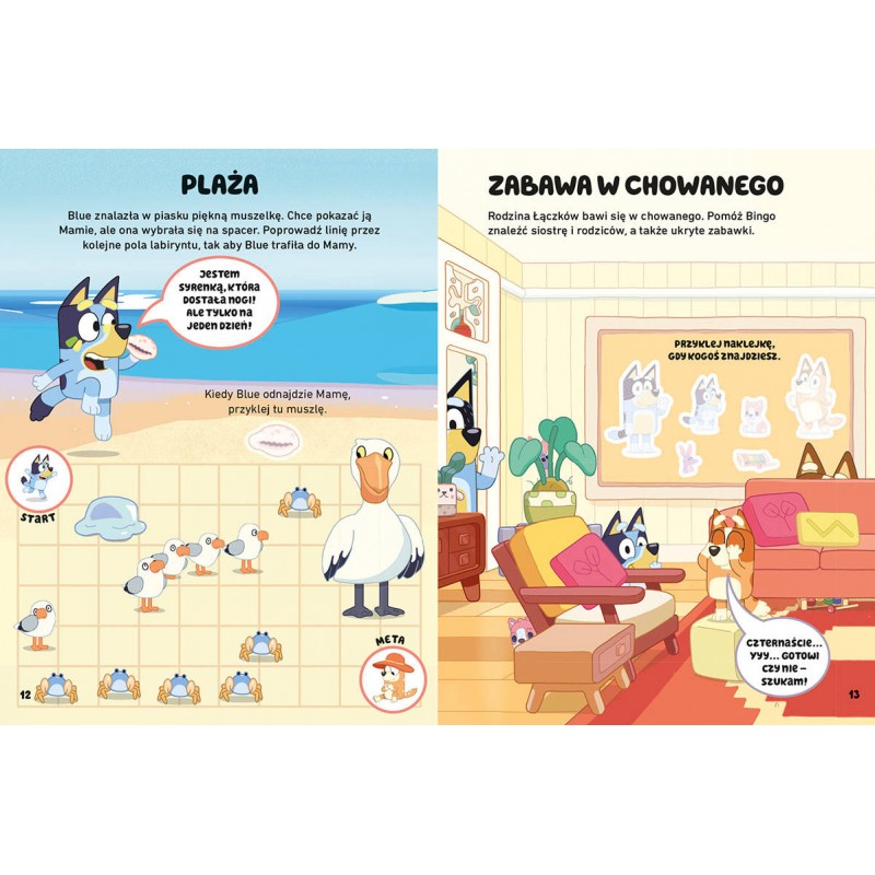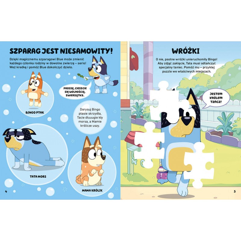 W tej książce czekają na ciebie zadania i łamigłówki wszelkiego rodzaju! Są tu labirynty, obrazki do porównywania i do kolorowania, puzzle do naklejania, zabawa w tropienie robaczków w słownej wykreślance, a nawet… magiczny szparag, który zamienia bohaterów serialu w zupełnie inne istoty. Usiądź więc wygodnie, przygotuj ulubione kredki i flamastry i udaj się do świata Bluey (w polskiej wersji opowieści znanej także jako Blue), by rozwiązywać zadania, przyklejać naklejki i kolorować obrazki. Rozwiązywanie łamigłówek to nie tylko świetna zabawa i sposób na relaks, ale i okazja do ćwiczenia sprawności manualnej, spostrzegawczości, kreatywności i umiejętności logicznego myślenia młodego człowieka. Książka została opracowana tak, aby dziecko, które już umie czytać, mogło zajmować się nią samodzielnie. Maluchy, które zaczynają dopiero swą przygodę z literami, mogą bawić się w towarzystwie rodziców, co stanowi doskonałą okazję do wspólnego spędzania czasu w miły i wartościowy sposób. Oprócz książki z zadaniami na rynku są już inne tytuły Bluey – w tym kartonowe książki w kształcie piesków, kolorowanka i scenki do wyklejania z naklejkami wielokrotnego użytku.