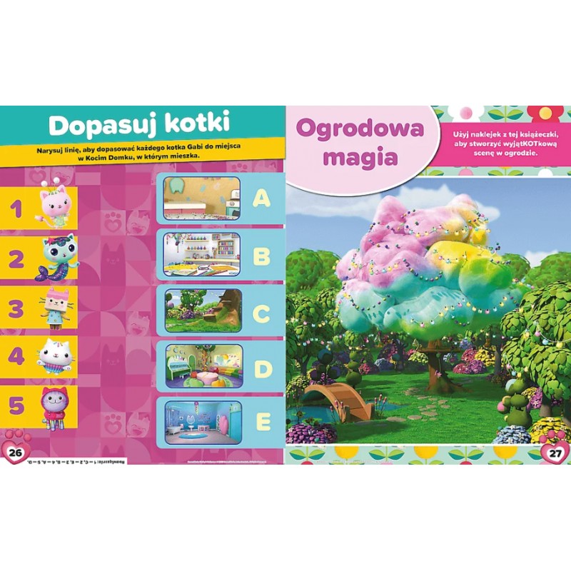 Dołącz do Gabi, Kiciusia Pandusia oraz ich przyjaciół, aby podczas wesołej przygody z naklejkami i zadaniami ćwiczyć logiczne myślenie i spostrzegawczość.