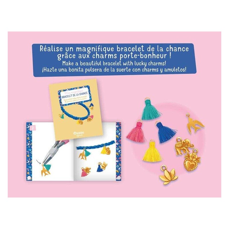 Zestaw Biżuteria DIY Kolorowe talizmany od Auzou. Zestaw zawiera wszystkie niezbędne akcesoria do stworzenia wspaniałej bransoletki z zawieszkami w postaci talizmanów szczęścia.