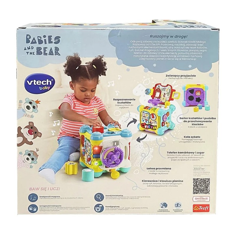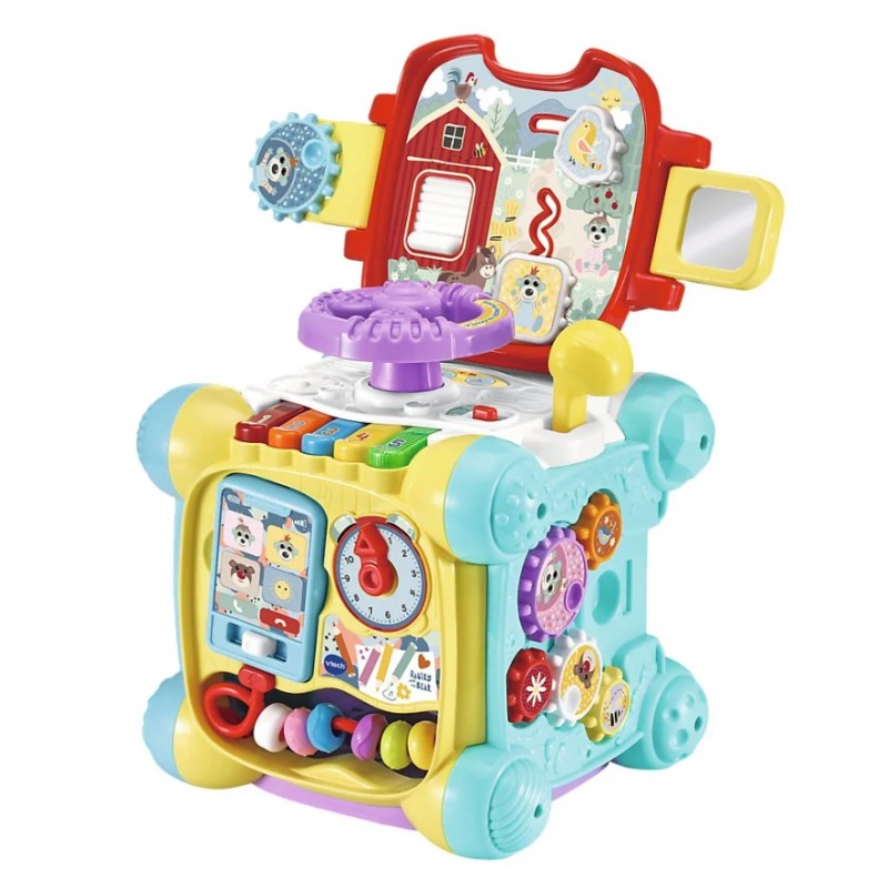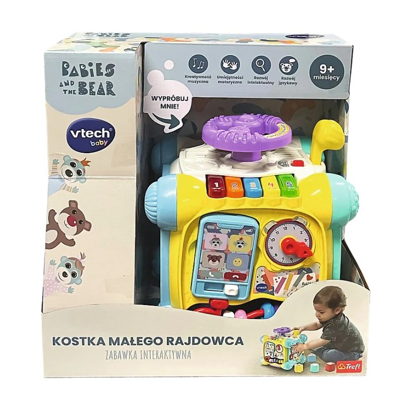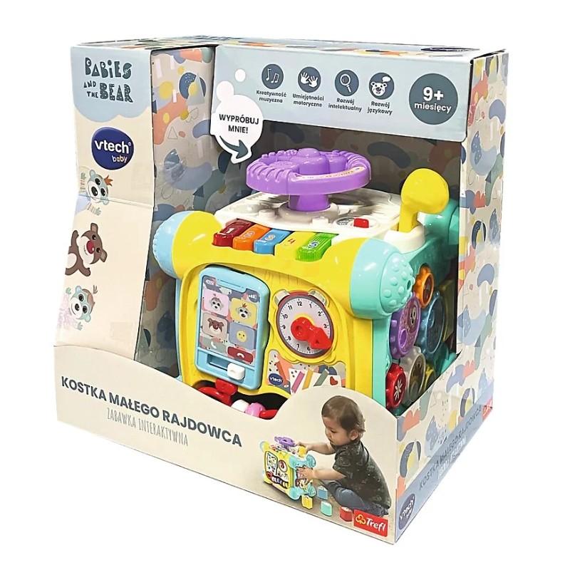 Kostka posiada 6 kolorowych ścianek do nauki i zabawy, a zdejmowany panel przemienia ją w samochód! Przesuwaj, naciskaj obracaj i kręć ruchomymi elementami kostki, aby nauczyć się nazw kolorów, cyfr, świateł drogowych i wielu innych. Klawisze pianina, zegar, telefon i inne elementy pobudzą zdolności motoryczne dziecka i koordynację wzrokowo-ruchową.