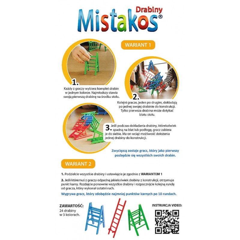 Dobra zabawa gwarantowana – teraz także w większym gronie! Pamiętaj, że gry z serii Mistakos możesz ze sobą łączyć. Graj krzesełkami i drabinami w jednym momencie i twórz jeszcze bardziej spektakularne konstrukcje!