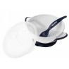 Pokrywka szczelnie chroni pokarm, specjalna komora przeznaczona jest do przechowywania łyżeczki, dzięki czemu jej nie zgubimy oraz zachowamy ją w czystości. Gumowa przyssawka uniemożliwia przesuwanie się miseczki po stole chroniąc jednocześnie pokarm przed rozlaniem. Wykonana w całości z bezpiecznych materiałów przeznaczonych do kontaktu z żywnością, nie zawiera bisfenolu A (0% BPA).