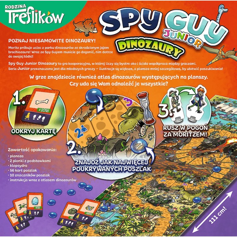 Spróbujcie schwytać złoczyńcę, nim ten ucieknie z parku dinozaurów z niezwykle rzadkim jajem brachiozaura. Ćwiczcie spostrzegawczość, umiejętność skupienia uwagi i współpracy, poszukując poszlak na barwnej, rysunkowej ponadmetrowej planszy.