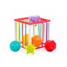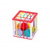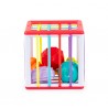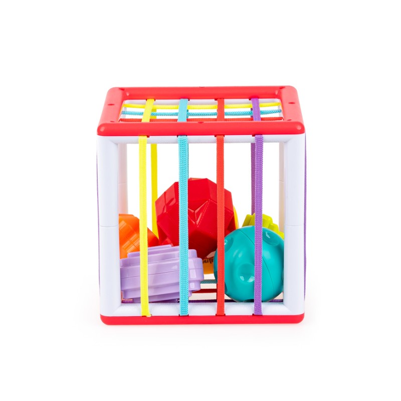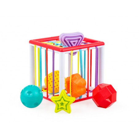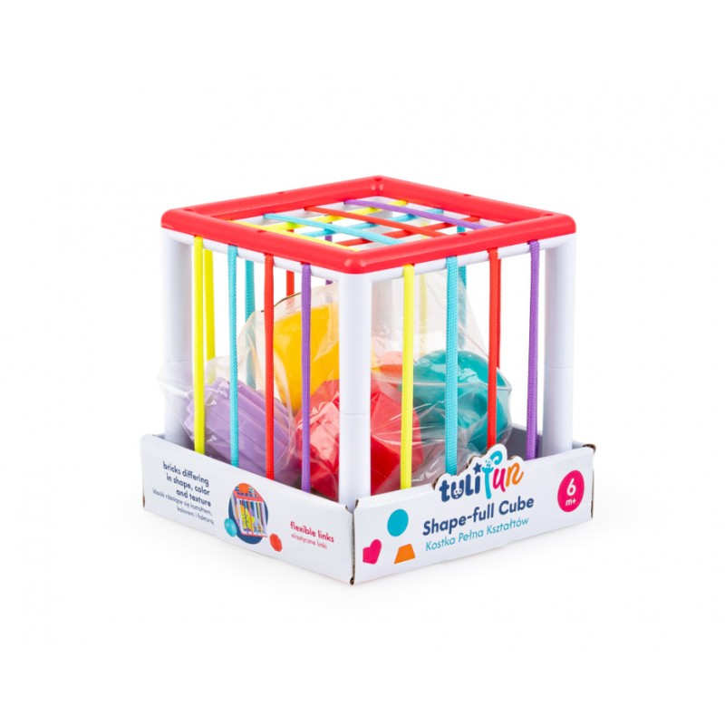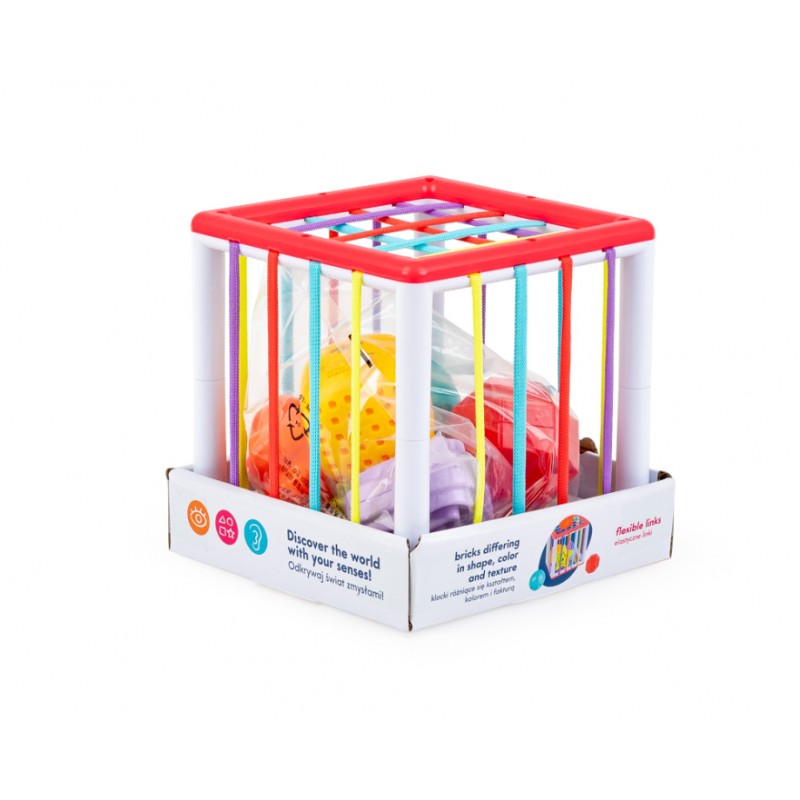 Ta inspirująca zabawka pozwoli najmłodszym odkrywcom poznać różnice pomiędzy poszczególnymi kształtami klocków, ich kolorem, a także fakturą. Poza stymulowaniem zmysłu wzroku i dotyku, zabawka oddziałuje także na zmysł słuchu maluchów, a to za sprawą grzechotania, które bobas usłyszy za każdym razem, gdy potrząśnie którymś z klocków. Dzięki temu, że sznureczki, tworzące ścianki kostki, są elastyczne, klocki można do woli wkładać do zabawki i wyciągać je na zewnątrz.